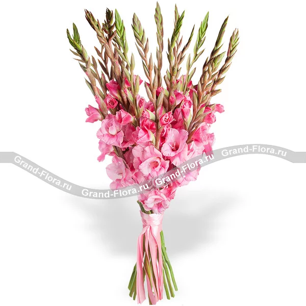Стандартный: розовый гладиолус - 11 шт., упаковка, лента розовая.